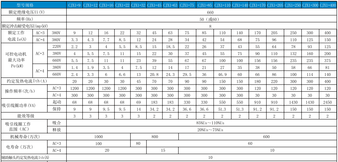 CJX1系列交流接触器(以下简称接触器)主要用于交流50Hz(或60Hz),额定绝缘电压为660V,在AC-3使用类别下额定工作电压为380V时额定工作电流为09~400A的电力线路中。作为供远距离接通和分断电路之用,并适用于控制交流电动机的起动、停止及反转。符合标准:GB/T 14048.4、IEC 60947-4-1及GB 21518
